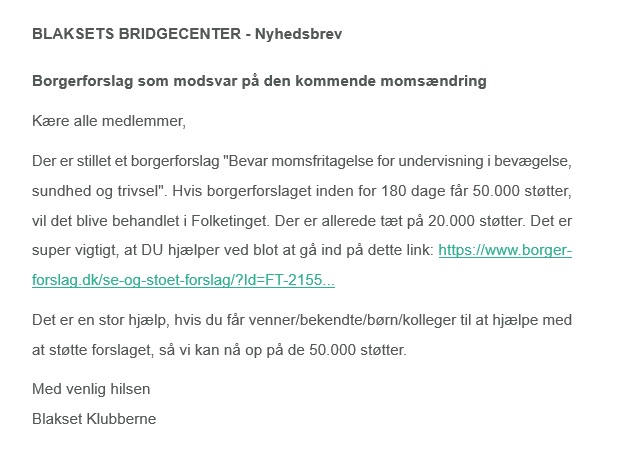 Der lægges muligvis moms på bridgeklubber fra 2026, så vi risikerer at skulle hæve kontingentet, og samtidig give vores stakkels kasserer en masse ekstra arbejde.